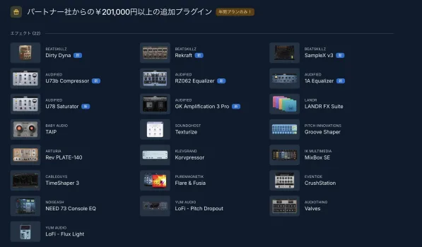 LANDR Studioには、なんと総額数万円〜数十万円相当のプラグインが含まれています。