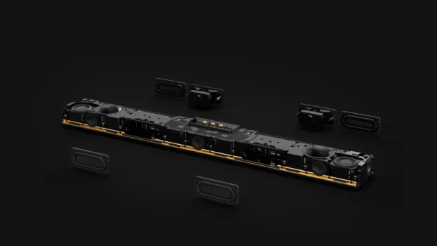 内蔵11基のアクティブスピーカーによって立体音響を実現しており、左右両端に上向きのミッドウーファー+ツイーター(天井反射の高さ方向音)と側面のフルレンジドライバー(サラウンド音)を配置、前面には左右とセンター用に3基のフルレンジドライバー、さらにその間に楕円形のウーファー2基を内蔵。